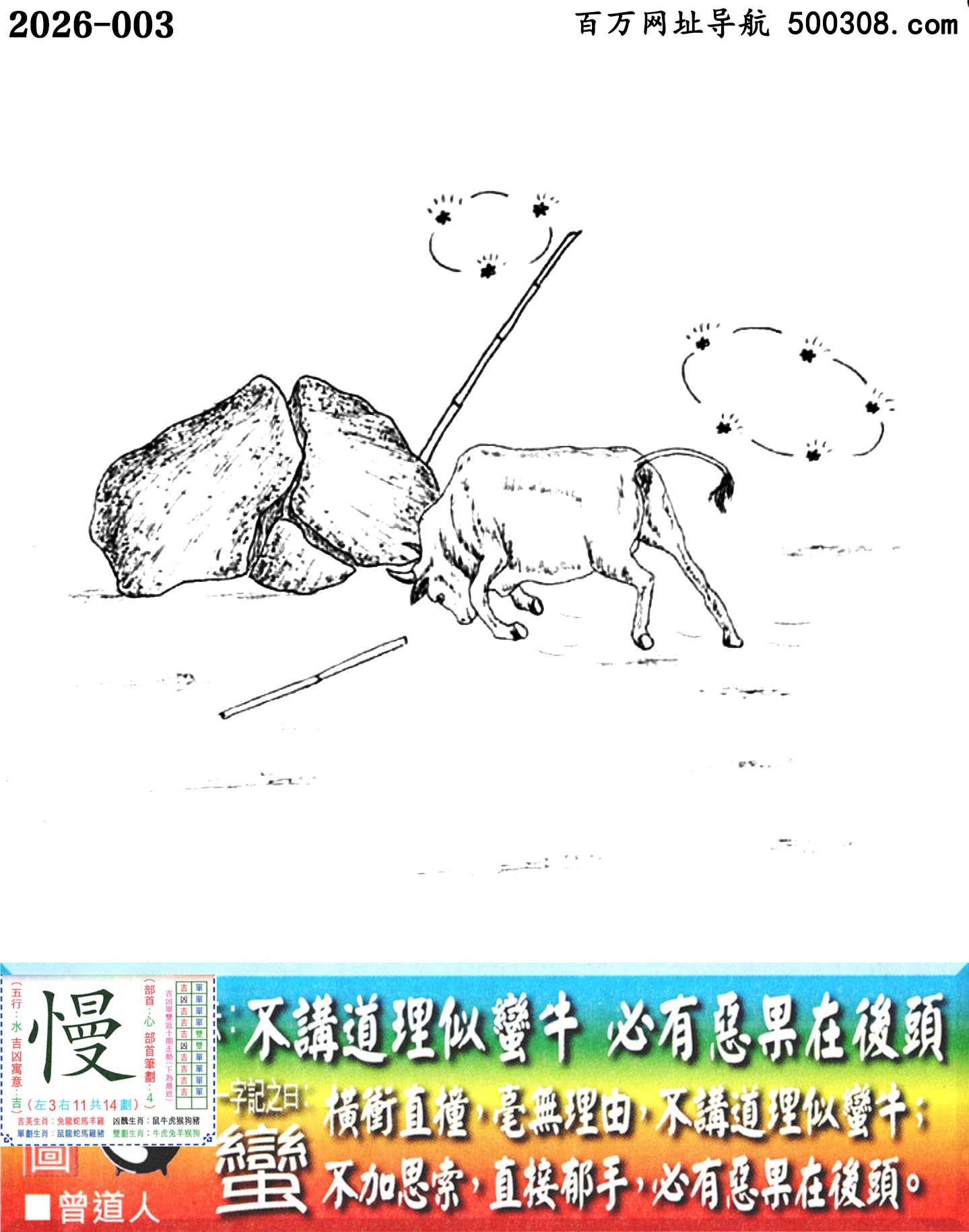 003期老版跑狗一字記之曰:【蠻】詩雲:不講道理似蠻牛,必有惡果在後頭。橫衝直撞,毫無理由,不講道理似蠻牛;不加思索,直接郁手,必有惡果在後頭。玄機測字:《慢》...